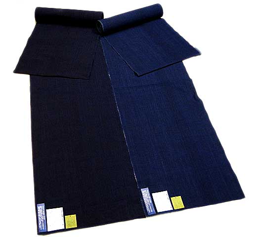 画像左の反物 正藍染め 濃い藍色 雨縞(途切れて、雨のように見える細い縞)在庫1反